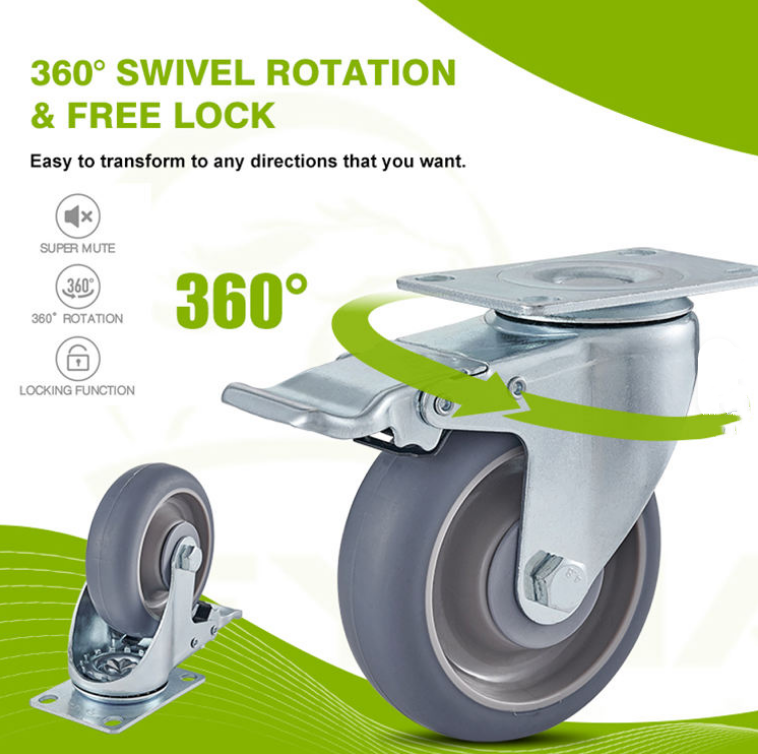 3/4/5 Inch Grey Medium Duty Caster TPR Top Plate Swivel Double Ball Bearing Caster Wheel With Brake Images |